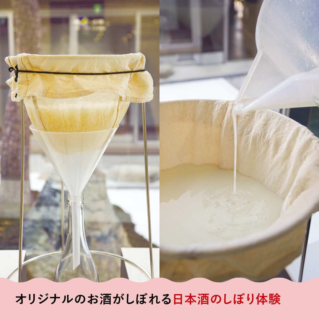 ツアーでは、日本酒のもととなる「もろみ」を搾る日本酒のしぼり体験に挑戦。しぼったお酒はその場で瓶詰めし、オリジナルの720mlボトルとしてお土産に持ち帰ることができます。