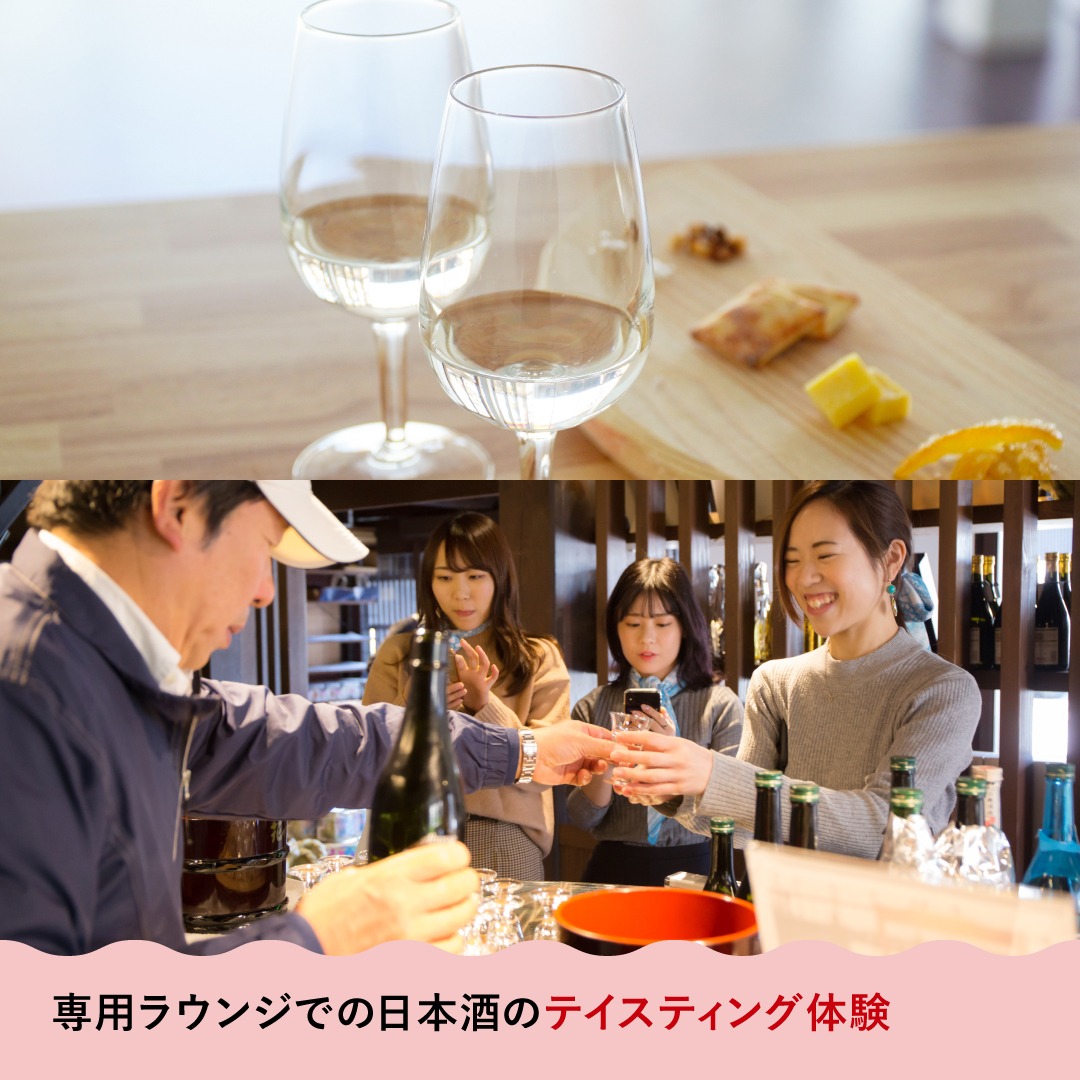 さらに、待ち時間には花の舞酒造自慢の日本酒をテイスティング。最後は専用ラウンジで、厳選されたお酒をじっくりと味わっていただけます。