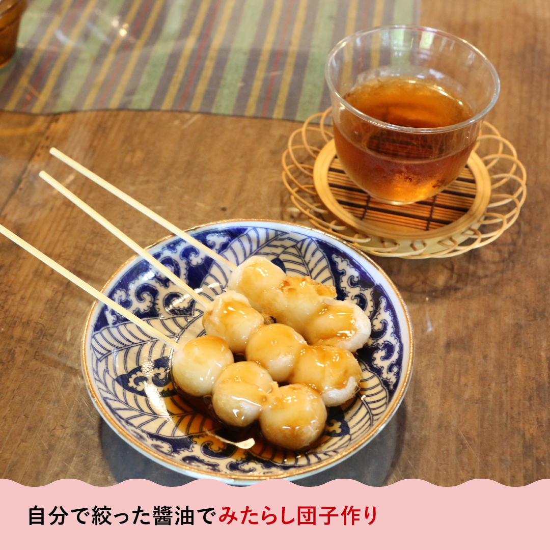 「明治屋醤油」では、自分の手で醤油を搾り、出来たての醤油でみたらし団子をつくって味わうという、特別な体験ができます。自社農園で育てた無農薬・無化学肥料にこだわった大豆と小麦を使い、じっくり熟成させた”もろみ”をゆっくり絞っていきます。搾りたての香りの豊かさとまろやかな味わいに驚くはず!!