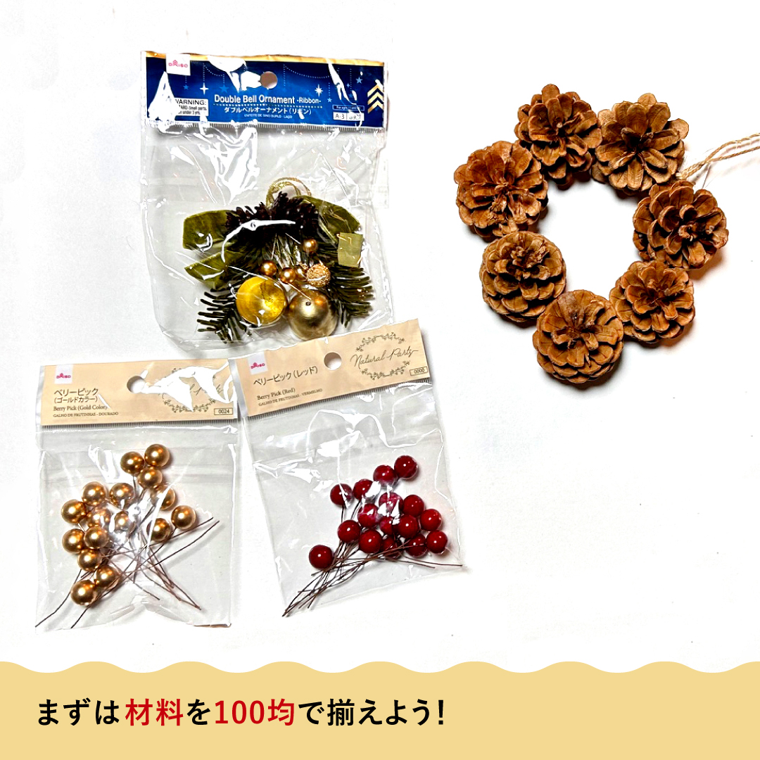 今回はダイソーさんで材料をそろえてみました。写真の松ぼっくりのリースはもちろん、ツタでできたものや、発砲スチロールのものなどいろいろなリースの土台があったのでお店で探してみるのがおすすめです。
