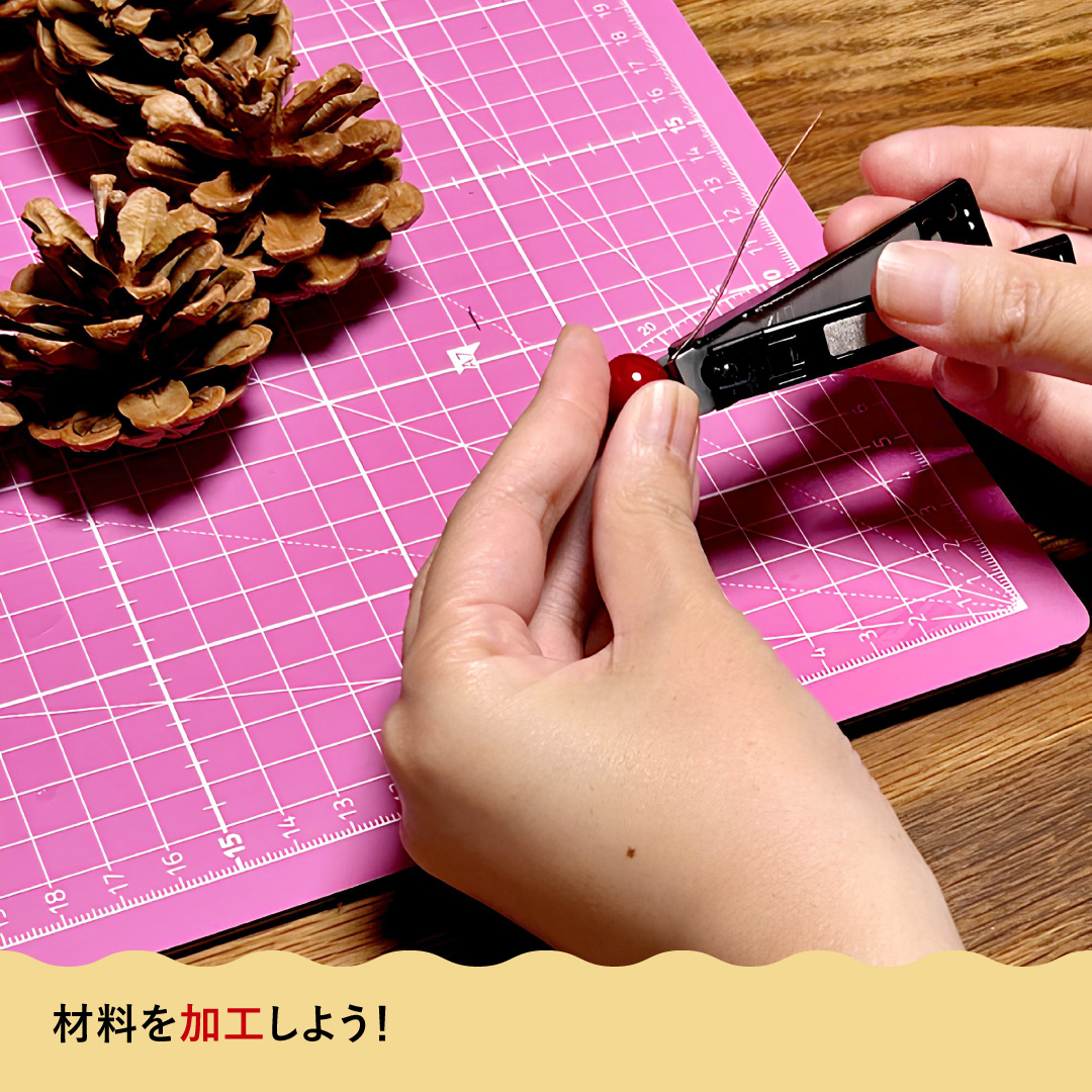 木の実の飾りはグルーガンで直接貼り付けるので爪切りなので針金部分を切っちゃいましょう!