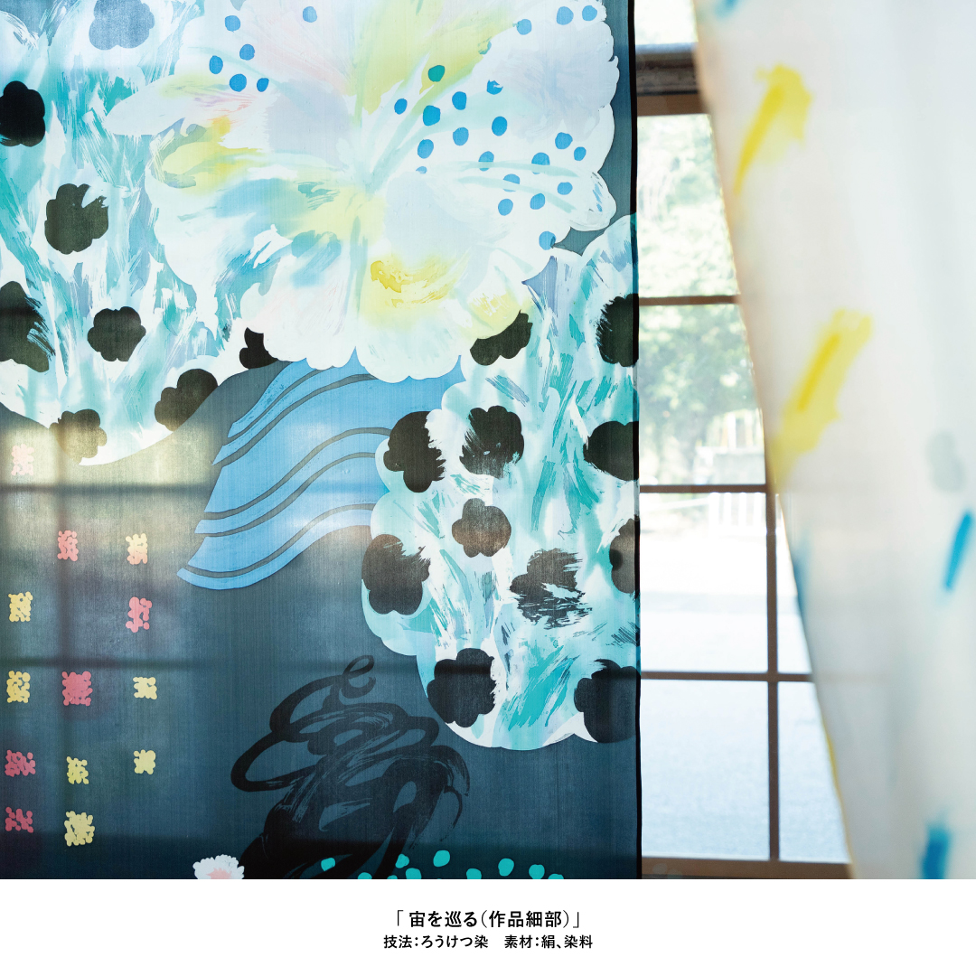 染めることで得られる素材自体の発色と、絵の具とは異なる質感に魅せられ、日本最古の防染技法である「ろうけつ染」という表現手法で作品を制作しています。染色は物質自体を発色させる行為です。染液が繊維の芯まで染み渡った時、柔らかな布の質感と色彩は、各々の記憶の中にある美しい景色の煌めきを呼び起こしてくれると考えています。伝統の技術を生かした独自の空間造形作品を展開し、人々の胸を打つような作品を目指して制作に励んでいます。