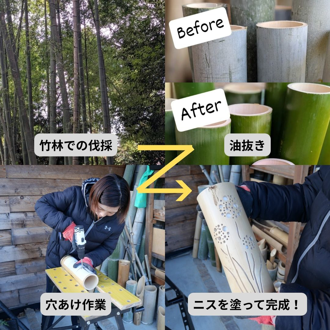 制作過程の楽しさと、ご近所さんの「すてきだね!」の声に後押しされ、2個、3個と数が増えるうちに、その視線は自然と、家の周りにある竹林へ向いていきました。