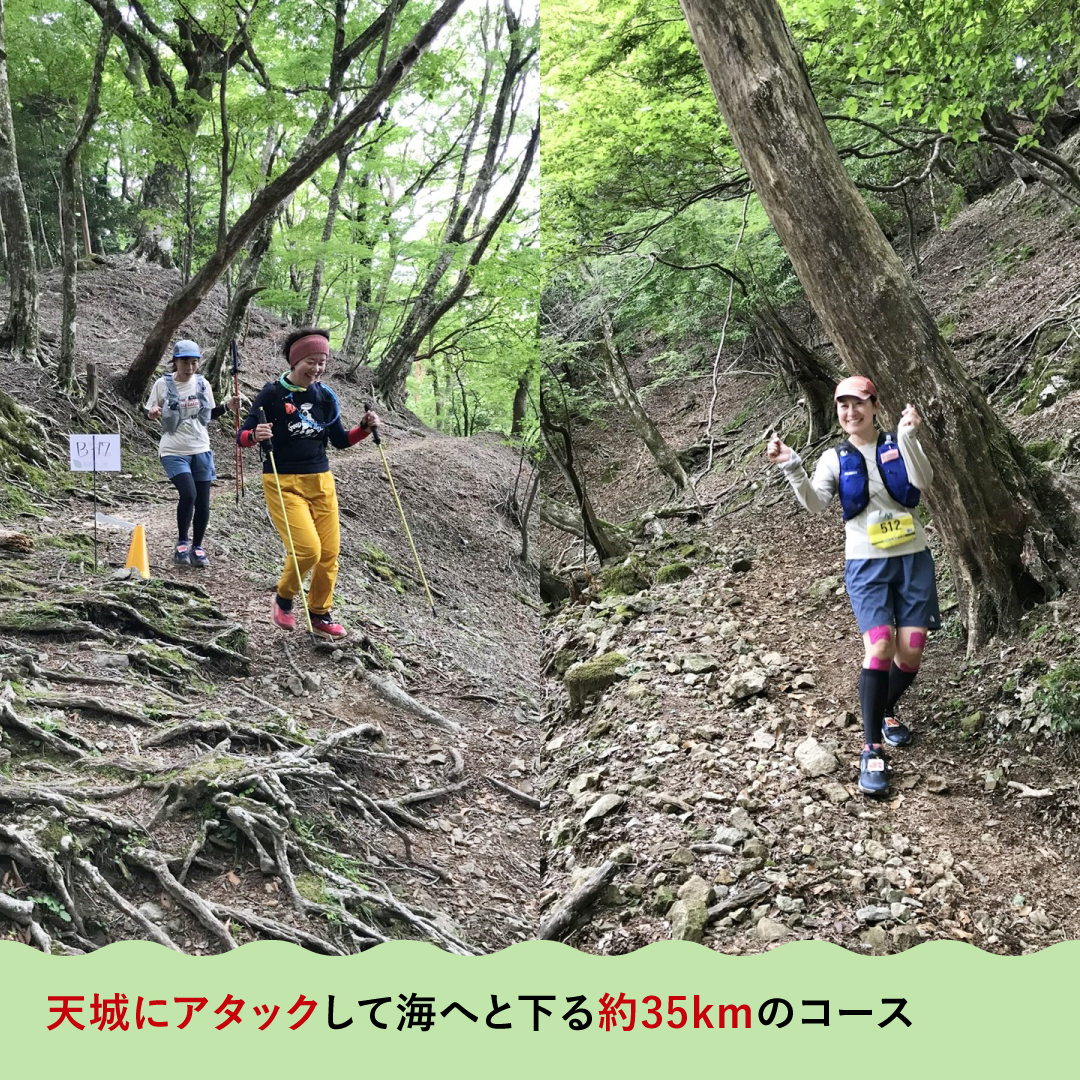 天城アタック35は河津町の名所を巡るトレイルランニングレースです。河津七滝をスタートし、歴史ある街道や稜線を走り抜け、「伊豆の踊子」で有名な旧天城トンネルで「天城越え」を体験。里山を走り抜け、一気に海へと下る35km。