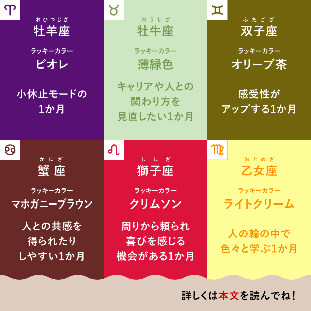 オフィシャル面が活発になる見込みの1か月。前半は人脈が広がったり頂き物をもらうことが増えるでしょう。後半は落ち着いて情報収集や経過の確認に力を入れましょう。