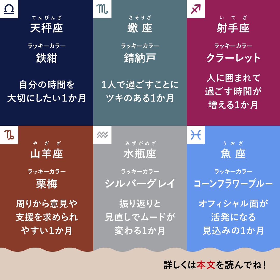 キャリアや人との関わり方を見直したい1か月。前半は「他人を鏡」や考えるきっかけに内面を充実させられる時期です。後半はオフィシャル面で何らかの改革や変化が起きる見込みがあります。