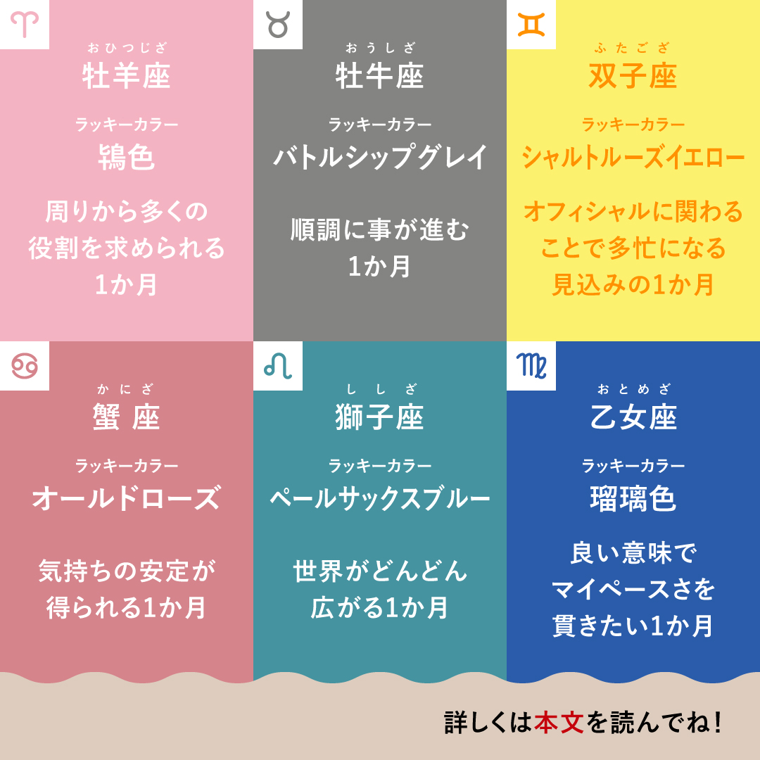 周りから多くの役割を求められる1か月。前半は人の感情や繋がりを意識して、極力、丁寧な言葉を使うことが運気アップにもつながります。後半は世の中や周りの動向に目を向けて。あなたなりに考察すると次の動きがとりやすくなるでしょう。
