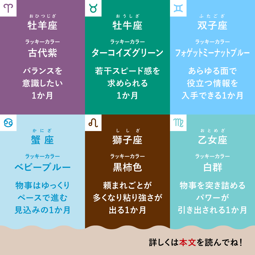 頼まれごとが多くなり粘り強さが出る1か月。前半は考えや気持ちもうまく表現すると周りからの評価も上がる時期。後半は時間が空いたら初めての場所を訪ねたりと心を刺激して下さい。