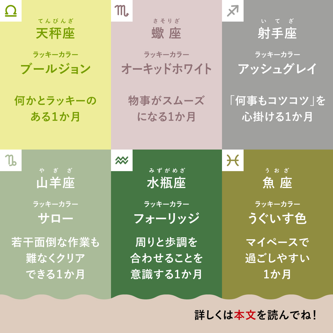 周りと歩調を合わせることを意識する1か月。前半はスピーディに事を進めるよりも1つ1つ着実に進めたほうが結果の出やすい時期です。後半は自分の好きにできる時間をもってベストバランスで過ごすと充足感を味わえるでしょう。