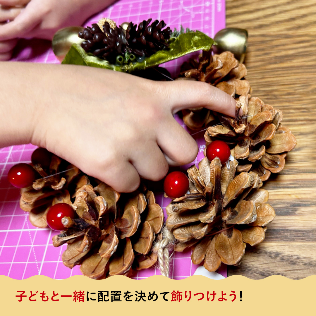 子供が言ってくれたところに飾りを配置(グルーガンは熱いので大人がやりましょう)して世界で一個だけのクリスマスリースの完成です!