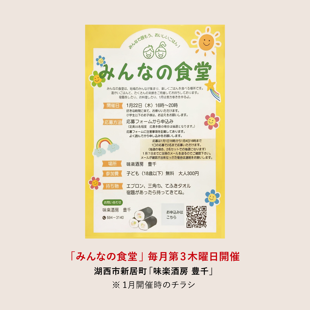 湖西市新居町の「味楽酒房 豊千」さんが3年前に始めた「みんなの食堂」。