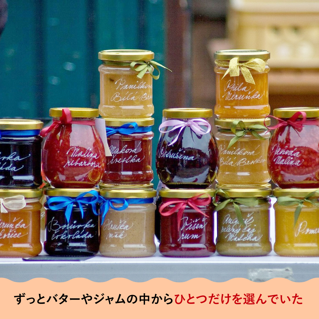 私はずっと、「今日は何にしよう」と考えながら、バターやジャムなどの中からひとつを選んでいました。