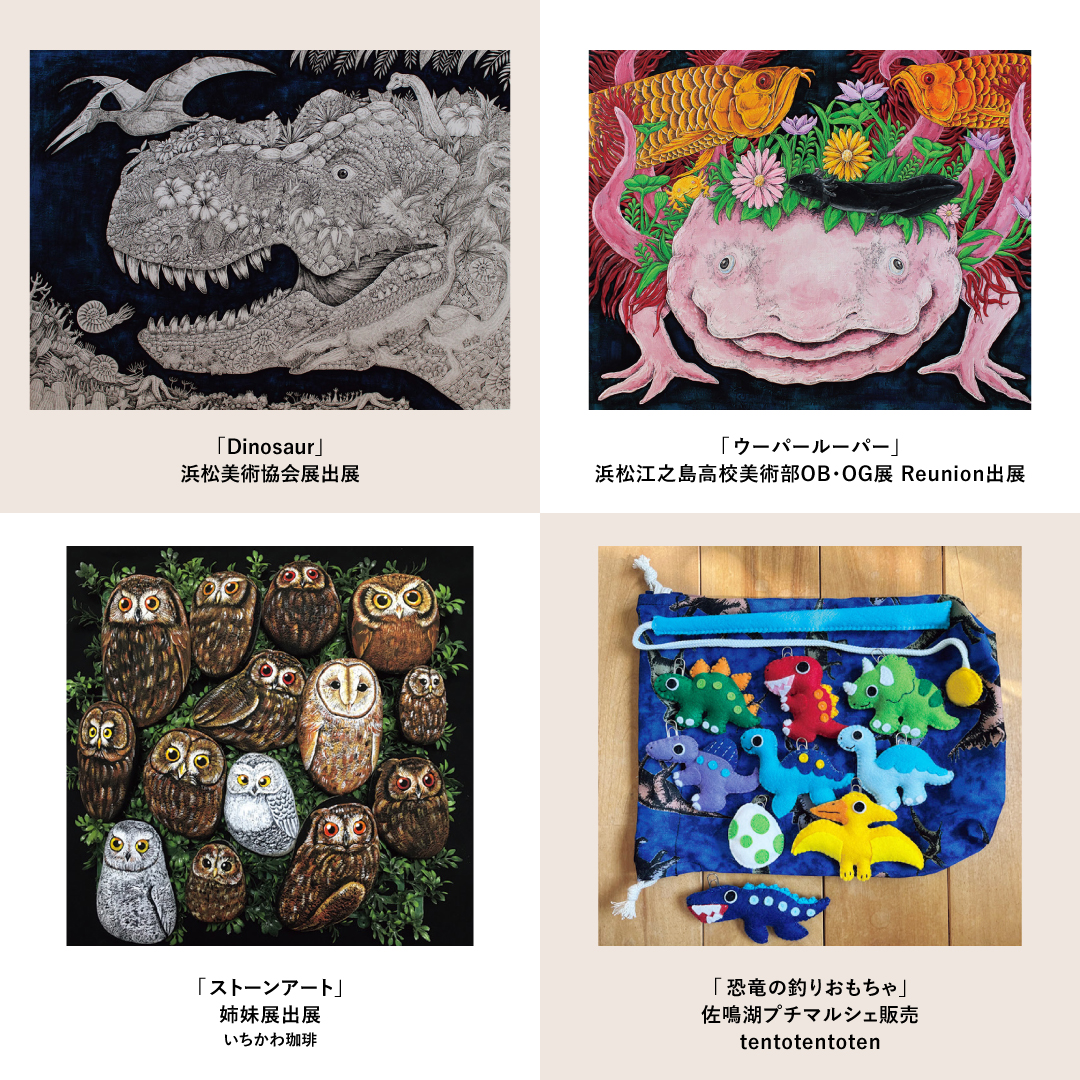 浜松市在住。子供の頃から絵を描いたり物を作るのが好きで制作を始める。浜松江之島高校油彩画専攻卒業。物を作る仕事がしたくて専門学校に通い歯科技工士の資格を取得後、歯科医院に就職。コロナ禍を期に手芸に目覚め、フェルト等を使った子供向けおもちゃや雑貨の制作もし始める。年間を通してハンドメイドマルシェへの参加、展覧会への絵の出展、親子向けイベントの親子工作の企画・運営などの活動をする。