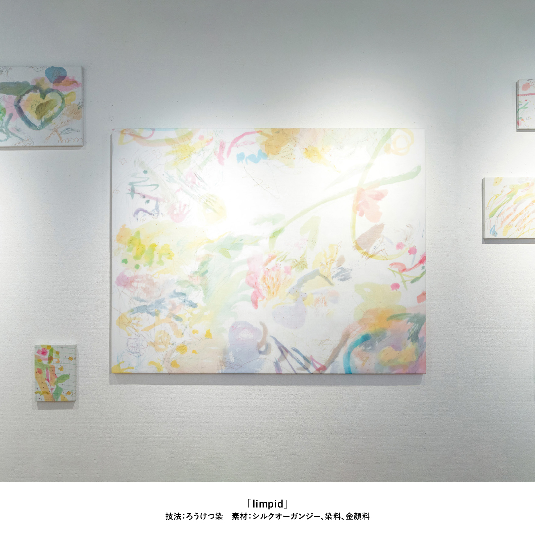 染めることで得られる素材自体の発色と、絵の具とは異なる質感に魅せられ、日本最古の防染技法である「ろうけつ染」という表現手法で作品を制作しています。染色は物質自体を発色させる行為です。染液が繊維の芯まで染み渡った時、柔らかな布の質感と色彩は、各々の記憶の中にある美しい景色の煌めきを呼び起こしてくれると考えています。伝統の技術を生かした独自の空間造形作品を展開し、人々の胸を打つような作品を目指して制作に励んでいます。