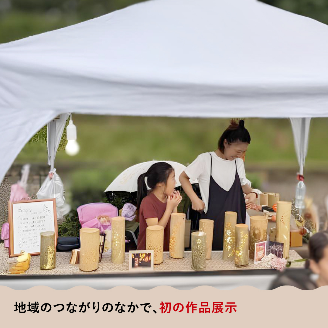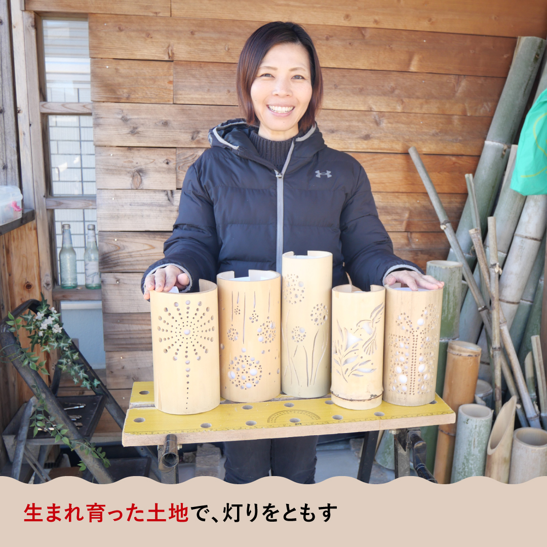 制作過程の楽しさと、ご近所さんの「すてきだね!」の声に後押しされ、2個、3個と数が増えるうちに、その視線は自然と、家の周りにある竹林へ向いていきました。